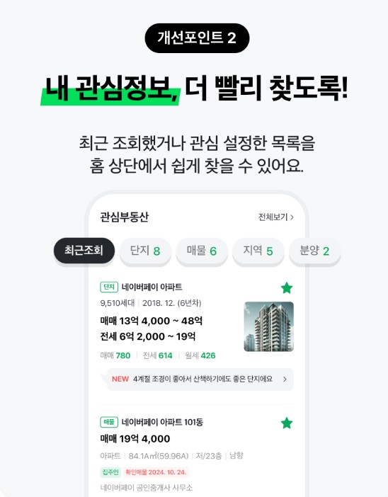네이버부동산에서는 최근에 조회했거나 관심 목록에 추가한 매물을 쉽게 찾아볼 수 있습니다.