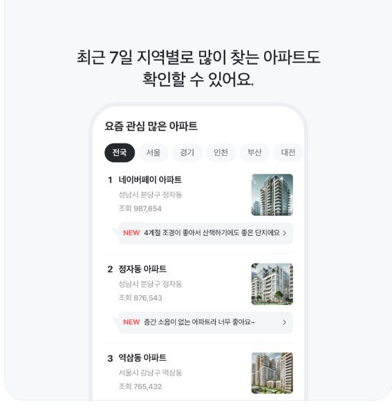 네이버부동산은 실시간으로 조회수가 높은 인기 아파트와 지역별 매물 순위를 보여줍니다.