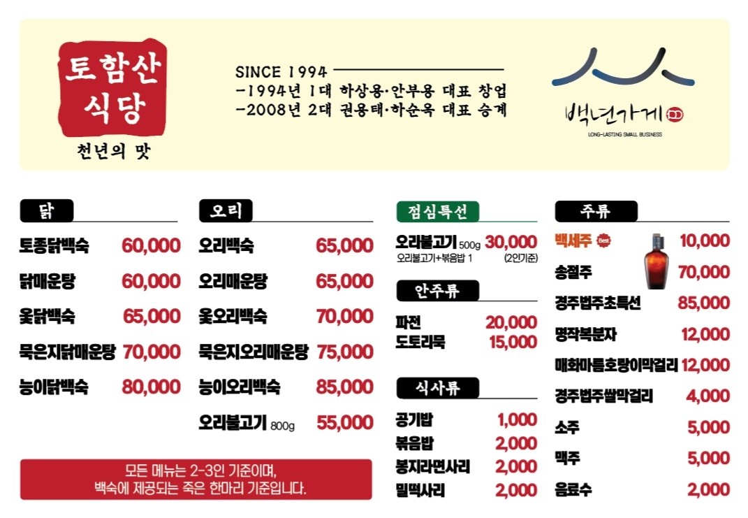 - 토종닭백숙: 60,000원