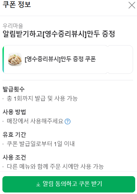 방문 전, 현재 우리 마을에서 만두증정 쿠폰이벤트중이니 아래에서 꼭 받고 가세요.