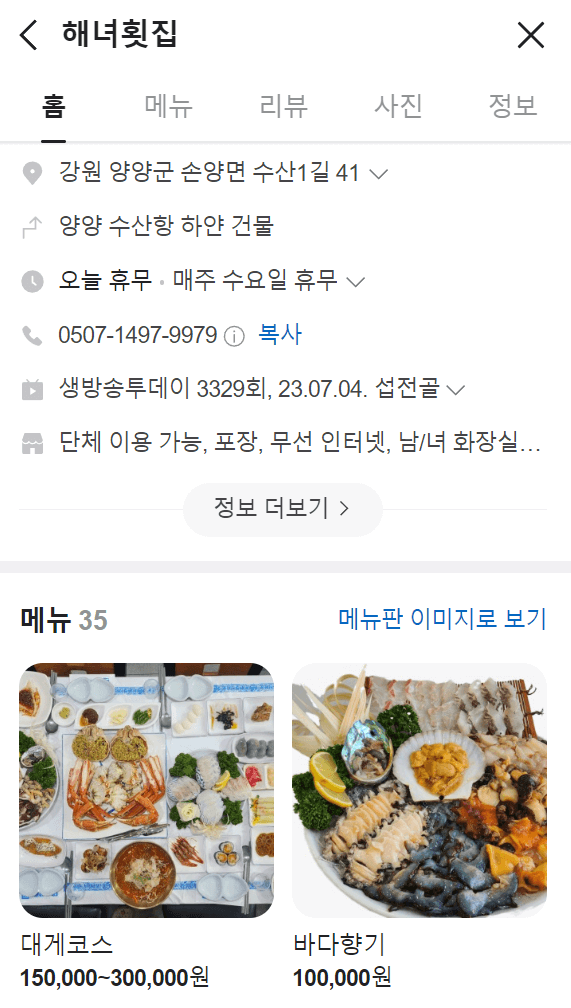 강원도 양양에서 50년 경력의 해녀가 직접 채취한 자연산 해산물을 제공하는 곳입니다.