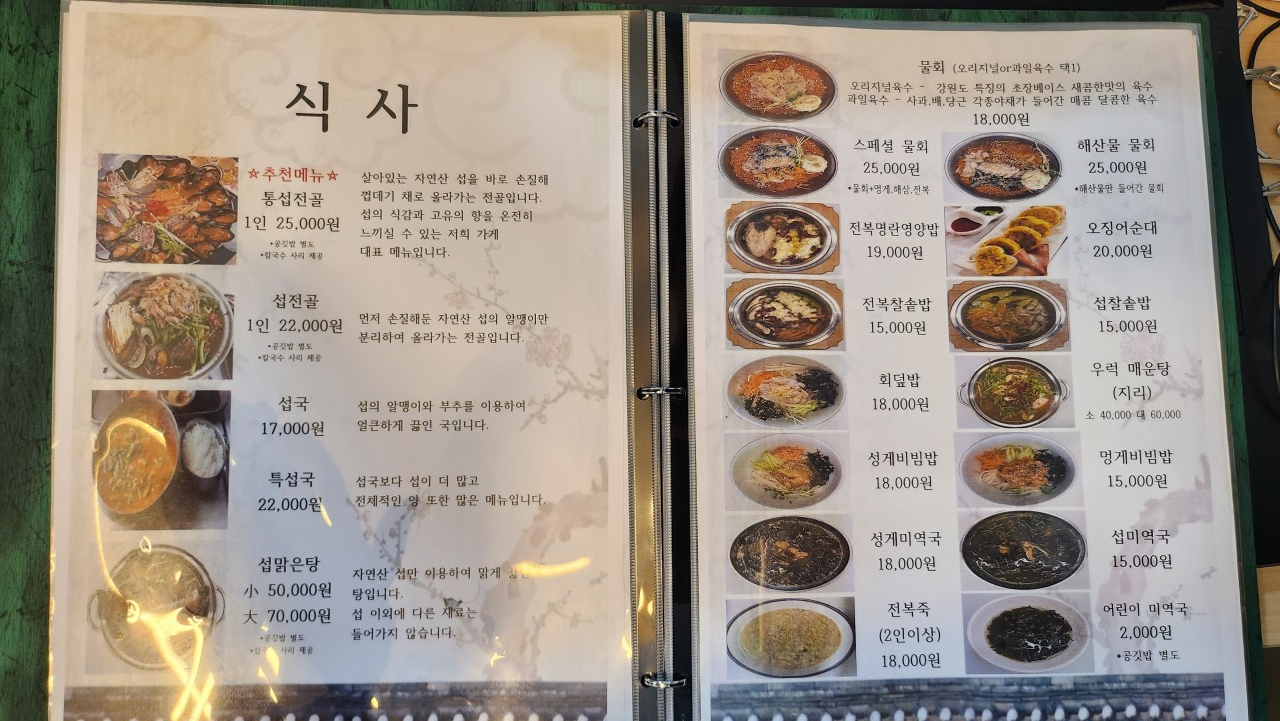 특히 자연산 홍합으로 만든 통섭전골은 꼭 한 번 맛봐야 할 메뉴로 손꼽힙니다.