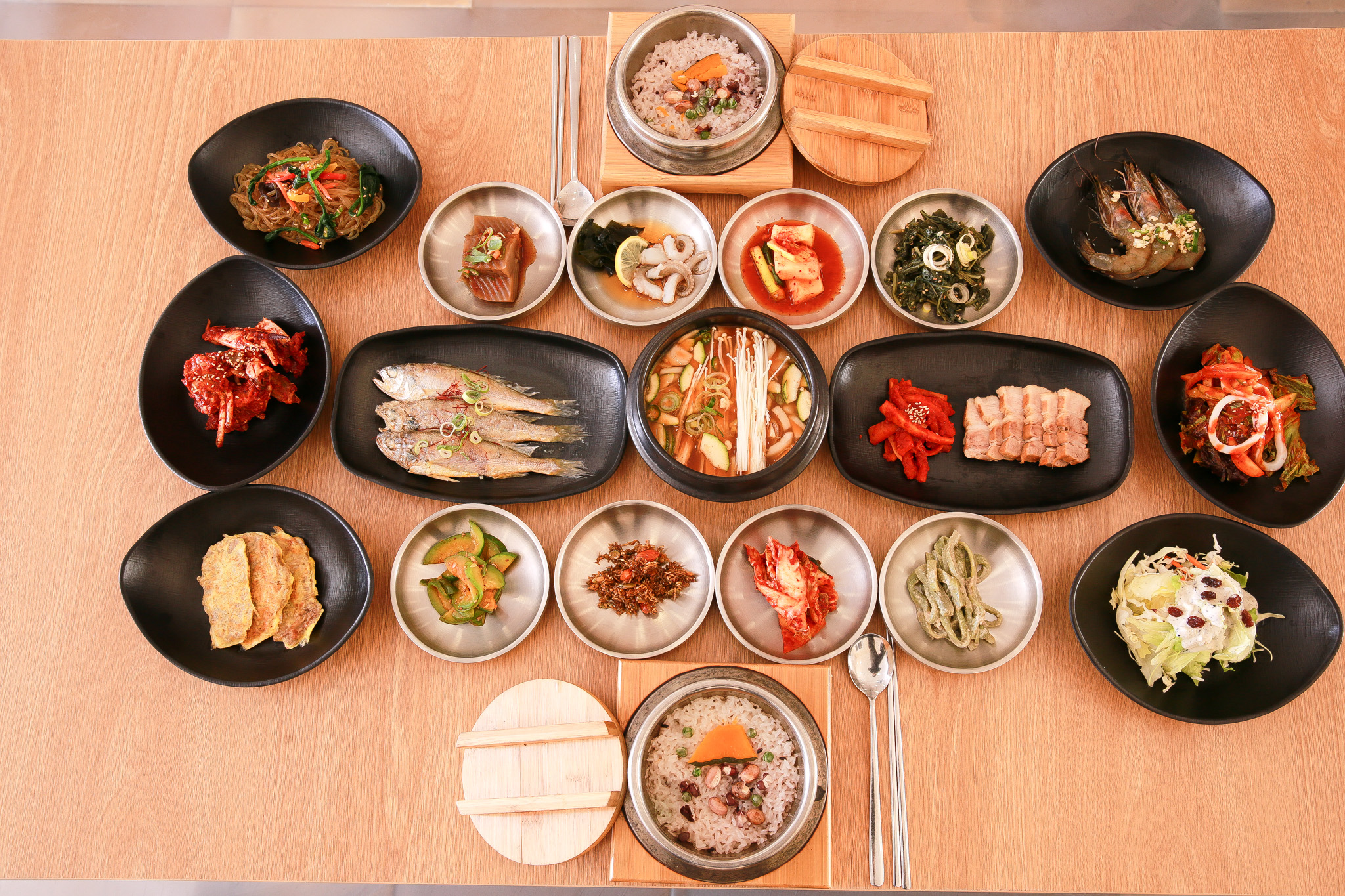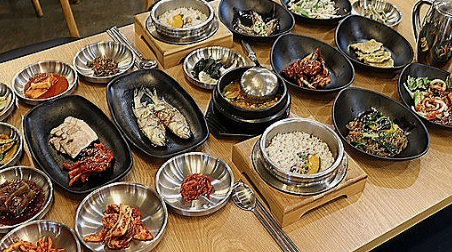 삼겹살 보쌈, 양념 꽃게장, 육전, 조기구이 등 18첩 반상이 제공되며,