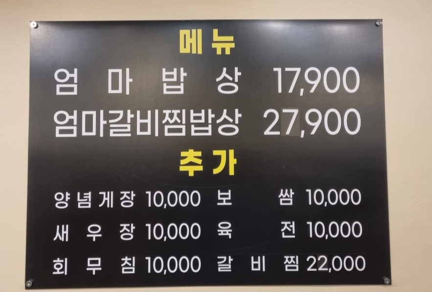 - 엄마갈비찜밥상: 27,900원(엄마 밥상에 갈비찜이 추가)