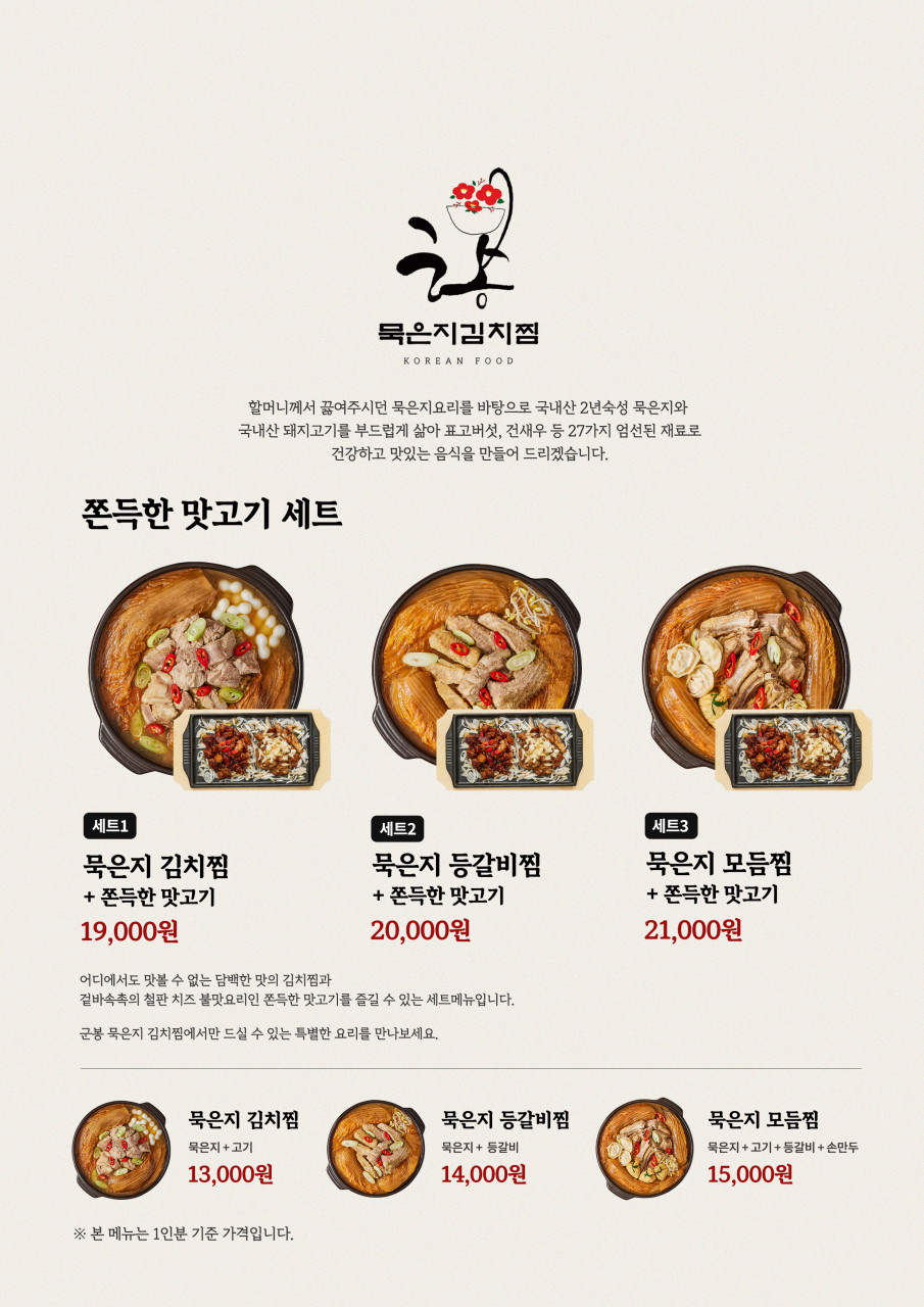 - 묵은지모듬찜 (고기+등갈비+만두): 15,000원