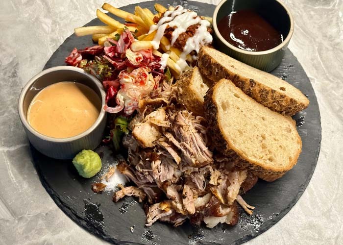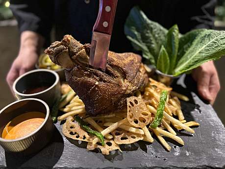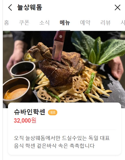 늘상웨돔에서 제공하는 슈바인 학센은 독일식 족발 특유의 겉바속촉(겉은 바삭하고 속은 부드러운) 식감을 자랑하며,