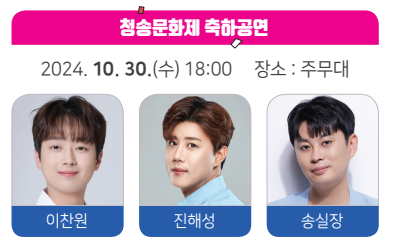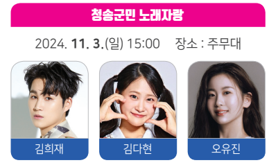 - 김다현, 오유진, 이소나 - 각각의 개성과 감성을 담은 무대가 이어지며 청송의 마지막 축제 날을 빛냅니다.