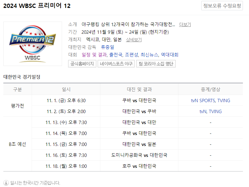 프리미어12 대회 한국 일정