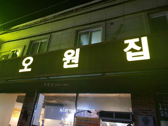 오원집은 연탄불 돼지구이를 김밥 쌈으로 즐기는 독특한 조합이 특징으로,
